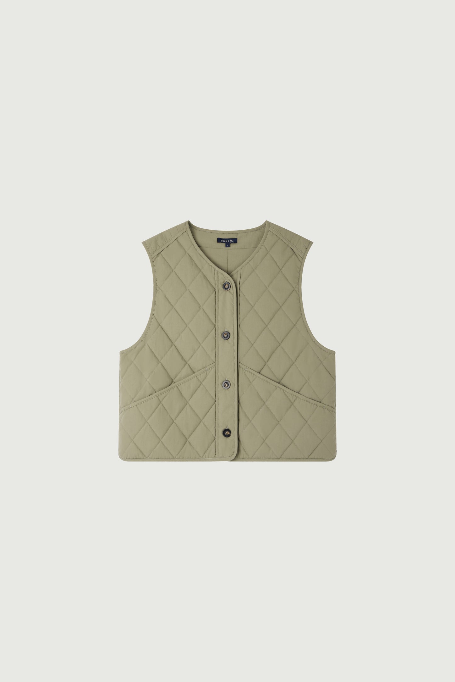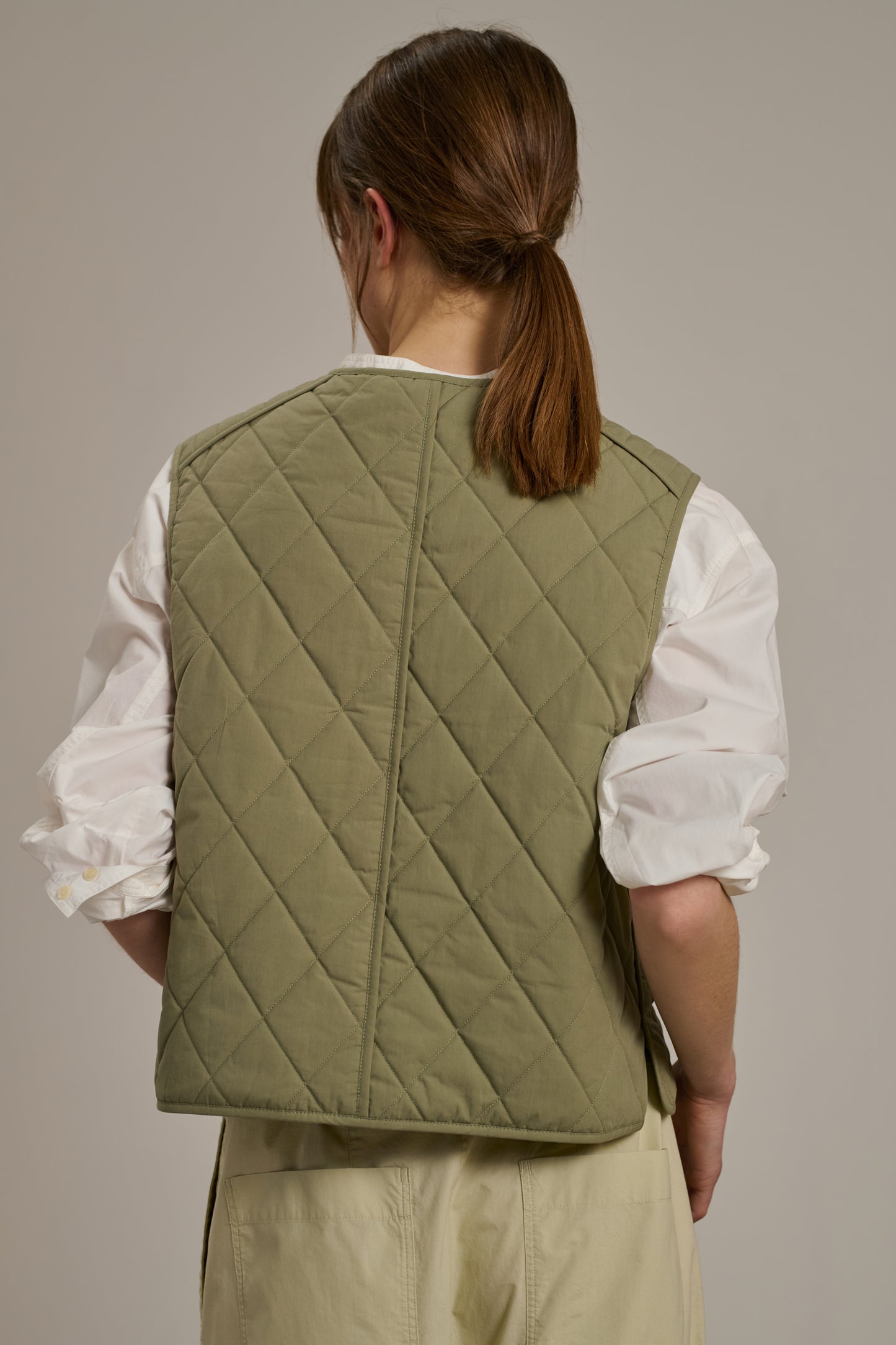 ULLA is a quilted cotton vest that can be layered as desired. It's lightly padded yet thin enough to be worn under a coat without hindering movement. Piping details accentuate the shoulders, patch pockets, and button placket.