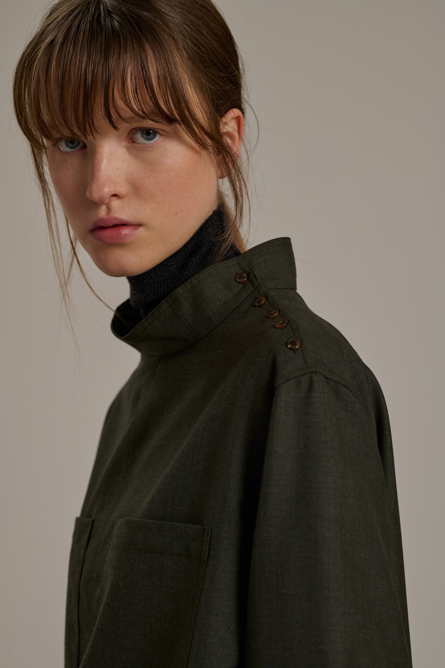 CANNES is a blouse crafted from wool-cotton canvas. Featuring a straight cut and extra-long sleeves, along with a funnel collar set away from the neck, it offers an elegant and comfortable style.
