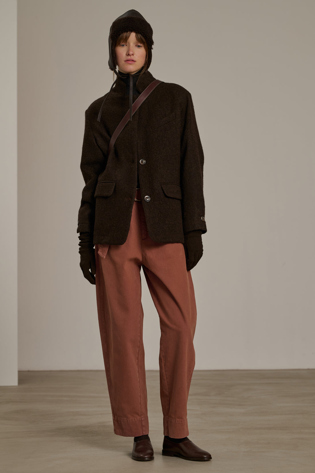 VOLAGE are high-waisted jeans adjustable with a wide slide belt. The thick cotton fabric emphasises its rounded volume. It's recognisable by its slanted-cut pockets. The legs are intentionally long to offer varied lengths and can be worn rolled up.