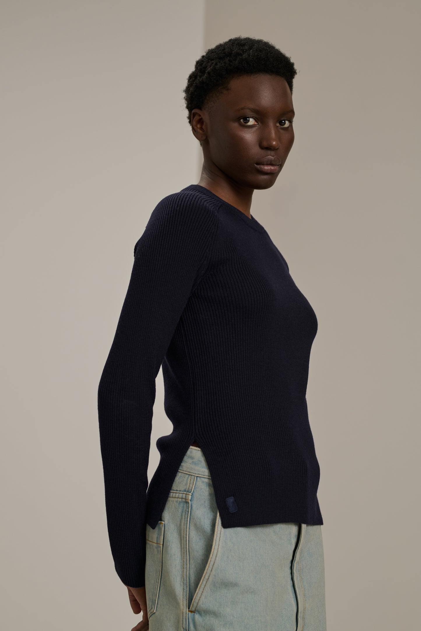 VERONA is a merino wool jumper with long sleeves, designed to be fitted and featuring a ribbed knit effect. It stands out with its side slits, adding a modern twist to its classic cut. Adorned with our tonal signature, it's a timeless piece that combines elegance and comfort.